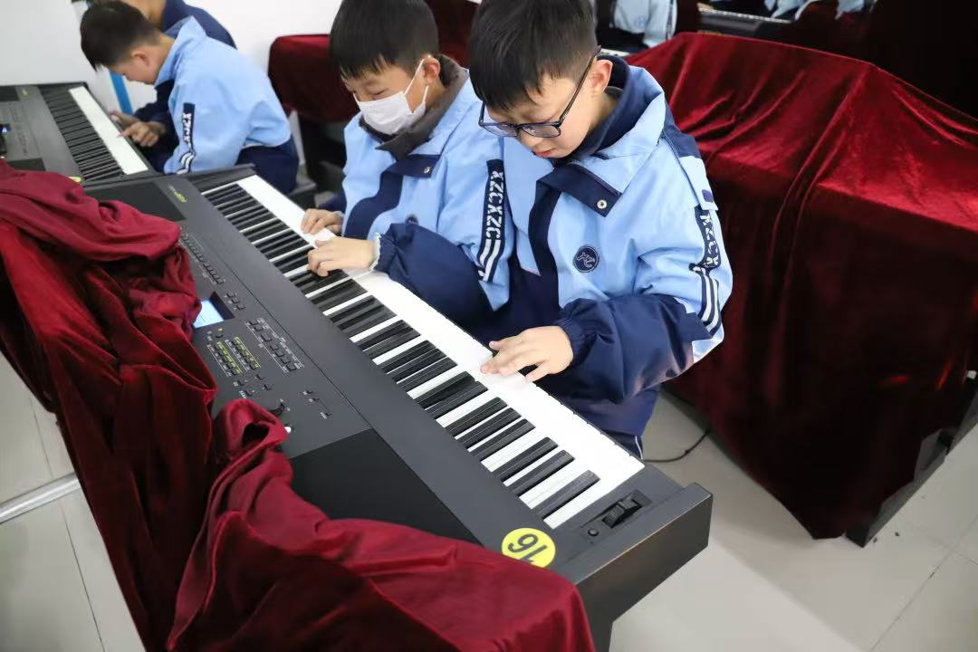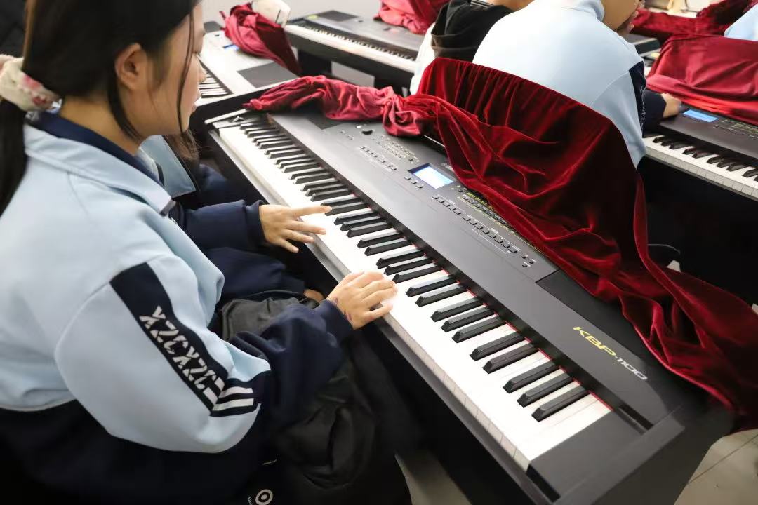 实操体验环节,指导教师采用分组教学的方式,一对一指导同学们认识琴键位置、练习正确的弹奏手势。“手指要自然弯曲,像握着一颗鸡蛋一样”“先找准中央C,再依次熟悉周边音阶”,教师们耐心细致的讲解和示范,让初次接触钢琴的同学们迅速放下紧张,专注投入练习。从单个琴键的敲击熟悉音准,到简单音阶的连贯弹奏,再到尝试演绎《小星星》《欢乐颂》等耳熟能详的简单旋律,同学们在反复练习中不断进步,现场不时响起清脆悦耳的琴音。
